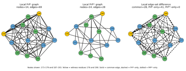 A key conclusion from this study is that the edge sets in the contact graphs do represent interacting partners, defined by the chosen distance thresholds between the witnessed residue pairs. However, the presence of an edge does not automatically imply a functional or causative interaction; for example, residues that are distant in the structure may or may not influence protein behavior through allosteric mechanisms, while more local contacts are likely to be more directly relevant. The observed differences in contact graphs reflect how these interactions act as structural variables and are incrementally modified, rather than providing a direct mapping to ionic interaction theory, biophysical interactions, or conformational dynamics. Importantly, this model aligns with current physical observations that the two forms of the major prion protein, PrPᶜ and PrPˢᶜ, are structurally distinct, despite having identical primary sequences.